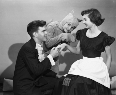 David Parker as "Prince Charming" kneels to "Cinderella," Lois Galloway, in rehearsal for the play "Cinderella of Loreland," that the seniors of McClean Junior High School will put on at 8 p. m. Wednesday and Thursday. Ashes the Cat, played by Ginnie Price, eavesdrops.