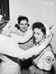 Mrs. R. B. Longerbeam, registered nurse, adjusts the new cap of Mrs. A. D. Powers while another new nurses aide, Mrs. L. R. Smith, looks on.