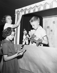 Jane Lemon, left, and Barbara Walker ready the "big top" for the Fort Worth Children's Museum puppet circus May 26 as Tommy Parker practices with two of the star puppets. Jane is the daughter of Dr. and Mrs. R. G. Lemon, 3806 Mattison; Barbara's parents are Dr. and Mrs. James N. Walker, 3837 Bunting, and Tommy is the son of Mr. and Mrs. W. T. Parker, 4424 Rutland.