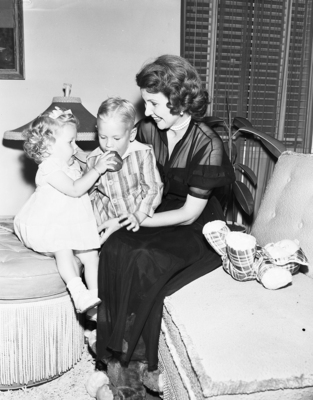 Mrs. John N. Covanes Junior, shown with her children, Colleen and John III, in their home, 118 Coventry Place, is the new president of the Junior Woman's Shakespeare Club.