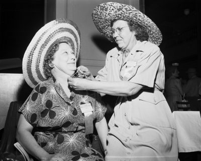 Mrs. Beulah McTaggart, left, and Mrs. Nora Penn, right, don hats they brought here from Parkersburg, West Virginia, for the Ladies Oriental Shrine convention. They rode bus 48 hours to reach Fort Worth.