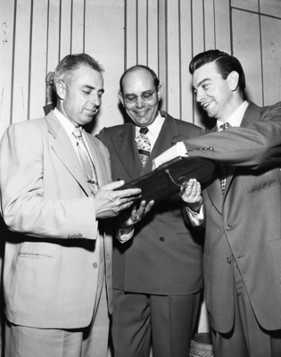 Tommy Vandergriff, right, points out some of the fine print to Jack Cherry, left, Arlington's "citizen of the year," on the plaque presented to Cherry. The Chamber of Commerce's new president, H. A. D. Dunsworth, center, looks on.