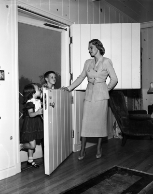 Mrs. C. W. Scott Jr., of 3667 Monticello Drive, is shown greeting her children, Mary Chilton, 4, and David, 6, by the Dutch door in the family's living room. Published in the morning edition, May 27, 1951.