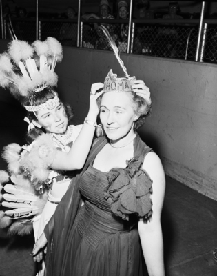 Will Rogers Memorial Coliseum was a rainbow of color Wednesday night as the Ladies Oriental Shrine put on their national exhibition drills. Mrs. Staton C. Coates, high priestess of Fort Worth's Nyanca Court, is crowned "Great Chief Nyanca" by Miss Martha Williamson, who dances with the Tulsa, Oklahoma, Indian drill platoon.