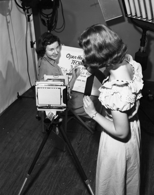 Patsy Hinton, left, daughter of Mr. and Mrs. R. W. Hinton, 1512 Boulevard, is shown preparing a poster for Technical High School's open house, set for 7 p. m. Friday. Photographing her work is another Tech student, Marilyn Henson, daughter of Mr. and Mrs. M. M. Goddard, 1517 Clinton.