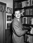 Reverend Boris Bessmertny is standing at a bookcase. He has a book in his right hand and his left hand is reaching towards the bookshelf.