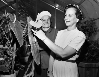 Mrs. W. O. Freeman, the retiring president of the Monticello Garden Club, right, was chosen to head the Fort Worth Council of Garden Club presidents for the next year. On the left of the image stands Mrs. A. T. Kennemer. Published in morning edition, May 20, 1951.