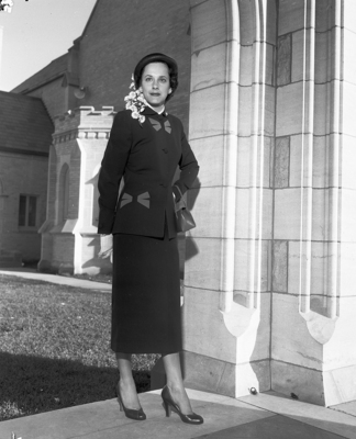 Perfect for Easter Sunday and throughout the spring is this trimly tailored navy gabardine suit with long-line fitted jacket over a pencil-slim skirt.