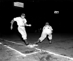 Norm Postolese, Cat outfielder, beats out a bunt for a single in the third inning of game at La Grave. Mission first baseman is Boris (Babe) Martin. Note the ball traveling toward bag. Missions won, 4-0. Published in Fort Worth Star-Telegram morning edition, May 17, 1951.