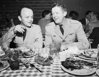 Lieutenant Colonel Hugh Mattia, left, contracts division chief for the Southern Air Procurement District, talks with Lieutenant Colonel Columbus Savage, new Air Force representative in charge at Convair, at an open house luncheon held by the district headquarters here Thursday.