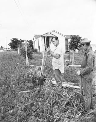 Jimmy Joe Wilson, 18, left, and his brother, Marvin, 16, of 3332 North West 30th, went right to work with post-hole digger and pick Thursday, repairing damage done at 3400 North West Lorraine when their auto went out of control and flattened a fence, then crashed into the house.