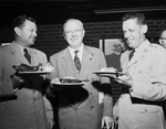 Colonel Beverly H. Warren, left, commander of the Southern Air Procurement District headquarters here, moves toward table at open house luncheon Thursday with George Thompson Junior and Lieutenant Colonel Rush Gibbs, assistant director of production. Thompson was a guest of the headquarters at a meeting and luncheon in connection with Armed Forces Week activities.