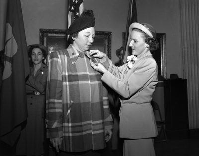 Mrs. G. R. Williams, left, receives a badge for outstanding service to the Girl Scout Council from Mrs. L. C. Turman, president of the board of directors, at a ceremony during a meeting of last year's day camp directors.