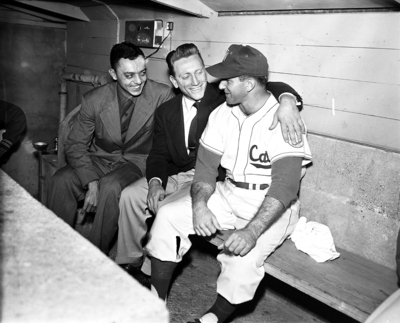 Two Cat newcomers , Nick Andromidas and Infielder-Outfielder Bob Bundy, talk with Bill McCahan, right, soon after arrival. Bundy played with the Cats in 1949 and 1950. Published in Fort Worth Star-Telegram morning edition, May 18, 1951.