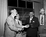 Fred Florence, left, presents Hoblitzelle awards for agricultural development, to Dr. C. E. Marshall, second from left, and Rusell Cash, Atlanta, Texas, farmer, second from right, as Karl Hoblitzelle, Dallas philanthropist, awards donor, right, stands by at presentation at Texas Research Foundation. Fred Florence can be seen handing out an award to Dr. C. E. Mashall in the photograph. Published in Fort Worth Star-Telegram evening edition May 17, 1951.