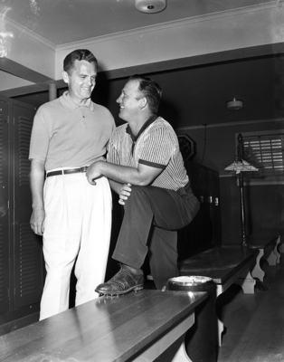 Image shows two participants talking in locker room before practice for the $15,000 Colonial National Invitation golf tournament. From left to right, Marty Furgol, Albuquerque, New Mexico and Chuck Klein, San Antonio. Published in the Fort Worth Star-Telegram morning edition May 18, 1951.