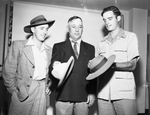 Colonel Joseph Dornblaser of Fort Worth, center, admires Australian hats owned by Roderick Stirling, left, and Pete Huybers during cross country agriculture tour of the two Queensland youths.