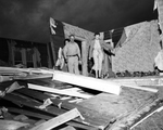 This image is part of a series that shows the aftermath of a tornado that flew through Olney, damaging over 100 homes and other buildings, resulting in two deaths. Mr. and Mrs. Fred H. Wendenburg are shown leaving their shattered home in Olney Texas after the tornado demolished their home. The couple was in their kitchen when the twister hit, but experienced minimal injured. An unidentified woman is visible behind Mr. Wendenburg. Published in the evening edition, May 19, 1951.