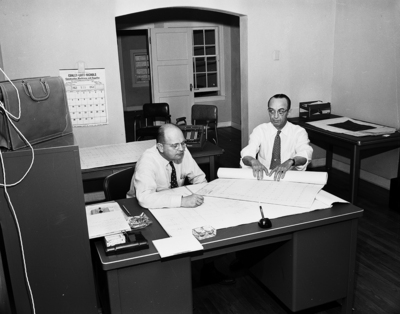 Checking over blueprints for the Bell Aircraft helicopter factory that would begin early constructions later that week are the project manager, Barney M. Winder of Houston, left, and project controller, Edward A. MacDonald of North Bergen New Jersy, right. Published in the morning edition, May 20, 1951.