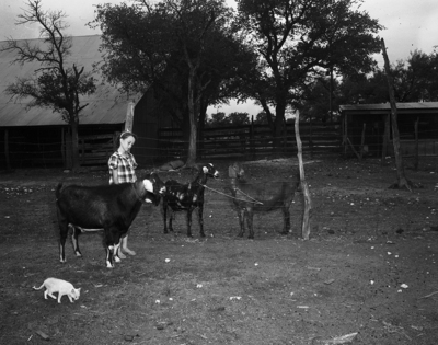 Peggie Lee Randle helps her father with his goat and dog business. she is shown here with "Old Bill," the Nubian herd sire, and one of the younger registered milk goats. Published in Fort Worth Star-Telegram July 1951.