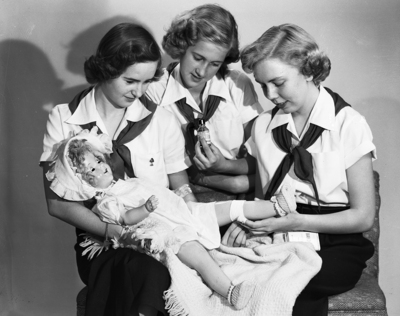 Three members of the Fort Worth Camp Fire Girls are shown participating in one of the graduation exercises for a course on child care and babysitting that would be held later that week. Demonstrating the first aid part of the course are, left to right, Patry Mathis, of Stripling Junior High School, Beverly Fike, of Riverside Junior High, and Barbara Brockman, of McLean Junior Hight. The course instructor was Registered Nurse, Mrs. K. K. Clark. Published in the morning edition, May 20, 1951.
