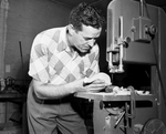 Image shows Charles Akey the process of how to make a golf club. He is shown cutting rough edges off unfinished clubhead at bandsaw machine. Published in the Fort Worth Star-Telegram evening edition May 24, 1951.