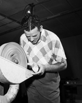 Image shows Charles Akey the process of how to make a golf club. After fiber insert and sole plate he smooths the head on sander. Published in the Fort Worth Star-Telegram evening edition May 24, 1951.