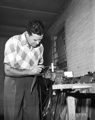 Image shows Charles Akey the process of how to make a golf club. Akey places a grip on club. Published in the Fort Worth Star-Telegram evening edition May 24, 1951.