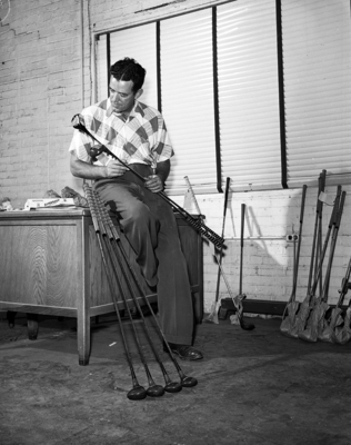 Image shows Charles Akey the process of how to make a golf club. Akey runs a test on club before finishing product. He is examining golf club, seated on desk next to four golf clubs. Published in the Fort Worth Star-Telegram evening edition May 24, 1951.