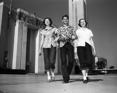 Magaret Johnson, of 3342 Eastland, eft, Tommy McMinn, of 1609 North West 25th, and Margaret Bedford, of 4608 Birchman, are shown walking with linked arms as they leave Will Rogers Memorial Coliseum with 175 other senior Boy and Girl Scouts and Camp Fire Girls for an outing at the Scouts' Worth Ranch. Published in the morning edition, May 21, 1951.