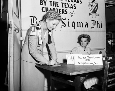 Miss Amelia Anthony, left, founder of Girlstown, USA, is shown signing in to receive a chest X-ray at the Texas Tuberculosis Association's Mobil laboratory. She would speak later that week to the state convention of Beta Sigma Phi, the sorority that donated the $23,00 unit and an additional $10,000 to the TB association. Seated to the right of the image is Mrs. Kathleen Moore, a Tarrant County TB Society staff member. Published in the morning edition, May 20, 1951.
