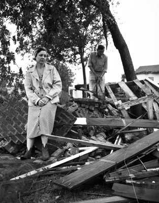 This image is part of a series that shows the aftermath of a tornado that flew through Olney, damaging over 100 homes and other buildings, and caused two deaths. Mrs. and Mr. Roy W. Copeland are shown looking at the smashed remains of their home. The couple had taken refuge in a cellar during the storm. Published in the morning edition, May 20, 1951.