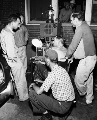 This image is part of a series that shows the aftermath of a tornado that flew through Olney, damaging over 100 homes and other buildings, resulting in two deaths. Members of Grand Prairie's Amateur Radio Club drove three radio-equipped cars to Olney to help relay messages from the town. Shown left to right standing are Rex Usher, George Haley, and Ruben Wolff; Charles Lewis and be seen seated in the background while Fred Alexander Kneels at the center of the image. Published in the morning edition, May 20, 1951.