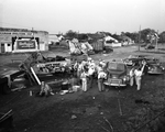 This image is part of a series that shows the aftermath of a tornado that flew through Olney, damaging over 100 homes and other buildings, resulting in two deaths. Electra's Chuck Wagon was set up shortly after the storm opposite the disaster headquarters at City Hall. The wagon would help to feed national guardsmen and volunteer workers. Published in the morning edition, May 20, 1951.