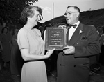 Mrs. W. T. Sutton, left, is shown re3cieving a plaque from Reverend Clarence A. Suton. The plaque was presented to Mrs. Sutton by the Wesleyan Service Guilds of Fort Worth. Published in the morning edition, May 21, 1951.