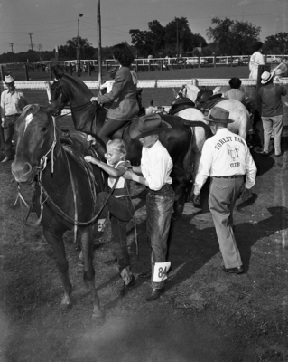 14-year-old Mike Cusack, of 3724 Country Club Circle, is shown assisting 10-year-old Jill Petersen, of 3530 Westcliff Road South, onto Mike's horse, "My Gal McCue," at the Forrest Part Saddle Club show. The bottom part of the negative is slightly blurry and smudged. Published in the evening edition, May 21, 1951.