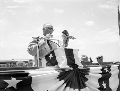 Bell Aircraft Corporation helicopter plant ground breaking ceremonies at Hurst, Texas. J. W. Carpenter is seen giving a speech at the podium.