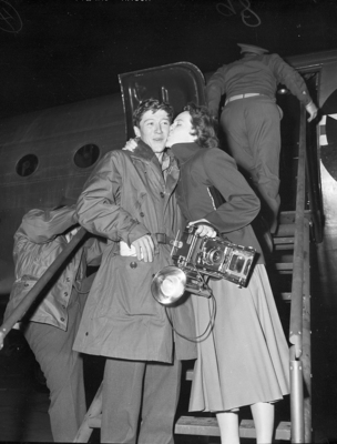 Nine crewmen were brought to Carswell Air Base. Their B-36 had trouble over Queen Charlotte Sound. The only one of the returning airmen with no one to greet him, Corporal Richard J. Schuler, a single man, is soundly bussed by Star-Telegram Reporter Peggie Spencer. Published in Fort Worth Star-Telegram morning edition, February 18, 1950.
