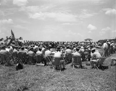 Bell Aircraft Corporation helicopter plant ground breaking ceremonies at Hurst, Texas. This shot from behind the events band.