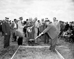 Bell Aircraft Corporation helicopter plant ground breaking ceremonies at Hurst, Texas. Left to right, Ben Critz, Amon Carter, T. J. Harrell behind Carter.
