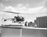 Airplanes Bell Aircraft Corporation helicopter atop Star-Telegram building. Grace Halsell receives news pictures from pilot Bill Quinlan.