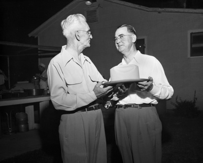 E. E. Dyess, left, is shown presenting Superintendent Joe Moore with a hat, during a dinner held by the Schoolmasters' Club. Published in the morning edition, May 22, 1951.