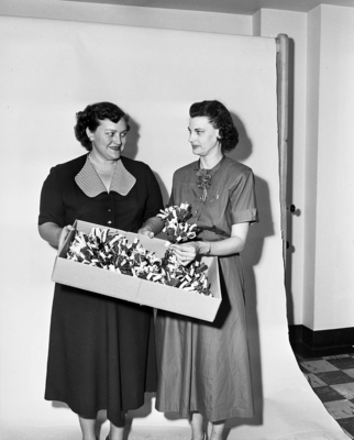 Preparing for poppy season and the annual poppy sale hosted by American Legion Auxiliary, Mrs. J. F. Morgan, left, and Mrs. Harlan Sloan, right, are shown preparing one of the thousands of display boxes that would be used to raise money for child welfare and rehabilitation. Mrs. Morgan was the citywide poppy chairman, while Mrs. Sloan was an auxiliary member. Published in the evening edition, May 22, 1951.