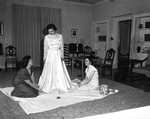 Brides are shown working to create their own weddings dresses. Shown left to right are brides to, Miss Catherine O'Conner, Miss Elena Ricardi, and Miss Mary Thomas. Miss Ricardi is shown modeling a dress that she made, she also made one that will be worn by Miss Thomas. Published in the morning edition, May 27, 1951.
