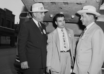 Grady Jones of the Burrus Mill and Elevator Company, L. C. Aikens of the Westbrook Hotel and Bud Curl of the Continental National Bank, left to right, are shown as they boarded a bus for a Chamber of Commerce Good Will trip to East Texas and Louisiana. Published in Fort Worth Star-Telegram evening edition May 22, 1951.