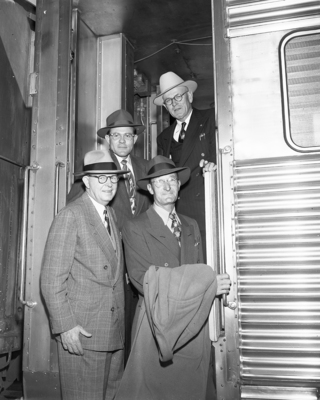 Delegates from the Home Builders Association of Fort Worth entrained for Chicago to attend the national association convention February 19-23. Front are W. B. Todd, left, and C. A. True, national directors, and back row are Walter Browning Jr., left, and W. I. Browning Sr. Published in Fort Worth Star-Telegram morning edition, February 18, 1950.