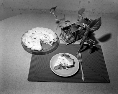 Image shows a table that has Angel pie. Beside the pie is a plate that has a slice of Angel pie and a plant. Published in the Fort Worth Star-Telegram June 1951.