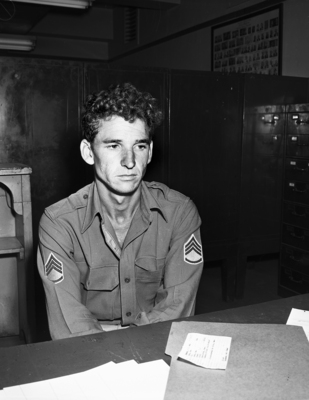 After three men wearing Army clothes robbed an E. Rosedale service station of $39.15 before dawn on Tuesday, May 22, 1951, the men fled in a stolen car and stirred a two-county man-hunt that caught two of the robbers an hour later in Grand Prairie. This image shows one of the robbers, Paul Scheumack, age 26. Published in the evening edition, May 22, 1951.