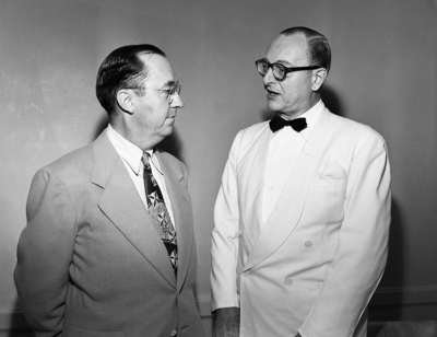 J. Bob Roberts, left, president of the Fort Worth Export-Import Club, is shown talking with Michael M. Mora of New Orleans at a dinner held by the club in observation of World Trade Week. Published in the morning edition, May 23m 1951.