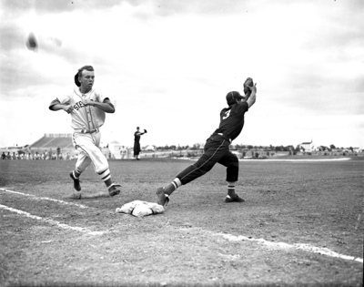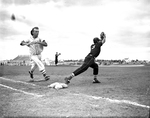 North Side's Charles Scogin loses cap and race for first in second inning at Texas Christian University, but Steers beat Crozier Tech, 2-1, to square bi-district playoff series. First baseman is Jesse Padre. Published in Fort Worth Star-Telegram evening edition, May 23, 1951. A man in a white baseball uniform running to a white base. A man in a black baseball uniform lunged out with a mit on his left hand getting ready to throw.